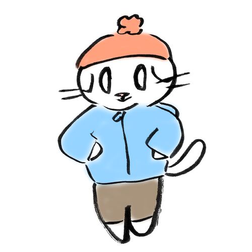 真冬の山歩きをする猫のイラスト 今回は真冬の低山トレッキングのレイヤリングを紹介しみゃすよ! 標高は1000mくらいで、あんまり山深くないところかつ、雪もそこまで積もらない軽アイゼンで行ける所のスタイルにゃ! まずは基本の話。山歩きの基本は通気性…
