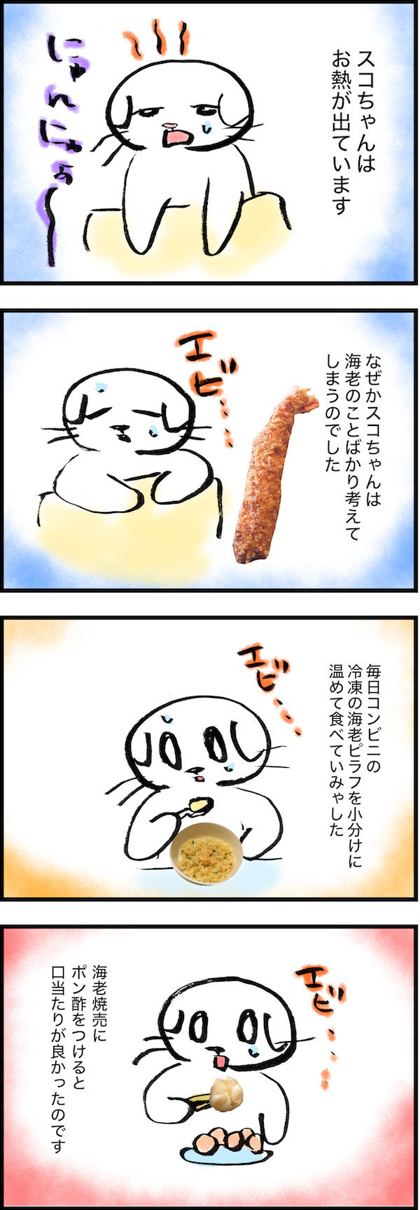 熱にうなされながら海老フライに想いを馳せていたスコちゃん、やっと食べに行けたのです。