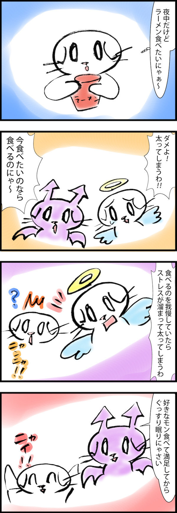 2019-03-10 夜中のラーメン問題 スコ漫画保管庫 あなたの頭の中にも天使と悪魔が住んでいみゃすか? 天使も悪魔も仲良しだったら葛藤する楽しみが無くなってしまいみゃすね 悪魔の声に耳を傾けるのである 結局、天使も食べることに関してOKを出しているのである
